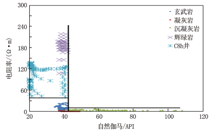 (3)C 8h井在测井曲线上具有低自然伽马、低中子孔隙度、高电阻率、高声波密度的特征。通过对该区的GR与RT交会图板进行研究,能有效地区分辉绿岩、玄武岩、凝灰岩以及沉凝灰岩,特别是对岩屑录井不易区分的玄武岩和辉绿岩的区分效果明显。