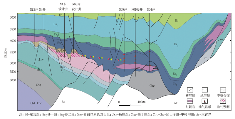 河间-肃宁洼槽位于饶阳凹陷的中部, 是饶阳凹陷最大的生油洼槽。赵皇庄-肃宁构造带毗邻河间-肃宁洼槽, 位于其南端。NG 5、NG 102、NG 4井是河间-肃宁洼槽钻遇沙三段较厚的3口探井(图2), 其中NG 5、NG 102、NG 4井钻遇沙三中、下亚段暗色泥岩厚度分别为200、56、110 m(3口井沙三下亚段地层均未钻穿)。NG 5井于沙三上、中亚段(井段4 417~4 886 m)见油斑、荧光砂岩合计49 m/13层; NG 102井于沙三上、中亚段(井段4 467.1~4 907.8 m)见荧光细砂岩32.8 m/12层; NG 4井于沙三上、中亚段(井段4 510~4 876 m)见油迹、荧光砂岩合计51 m/10层。说明河间-肃宁洼槽大于4 400 m深度有较好的油气生成能力。油源对比已证实, 肃宁构造带已成功钻探的NG 8X潜山油源来自河间-肃宁洼槽。剖面上NG 8X潜山与N 4井东断槽内的奥陶系地层与NG 5、NG 102、NG 4井沙三中、下亚段暗色泥岩对接, 油气运移通道畅通(图2)。