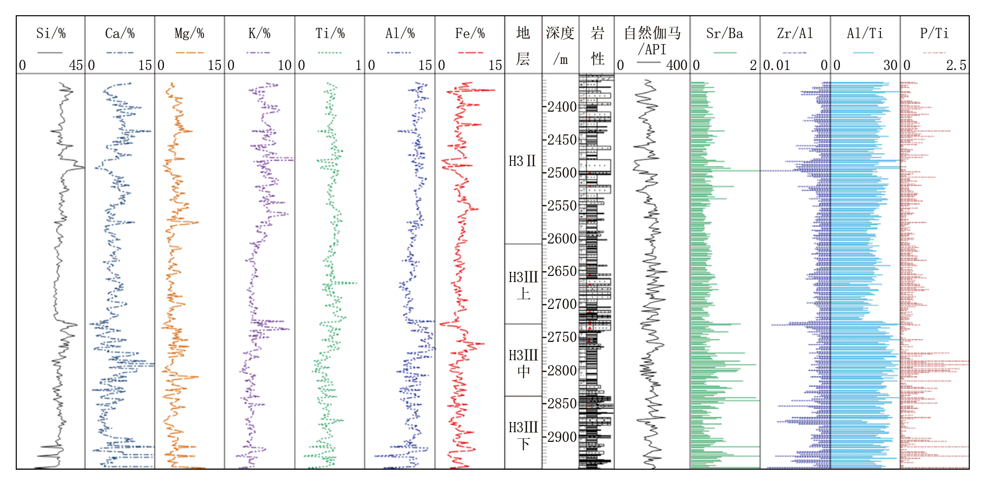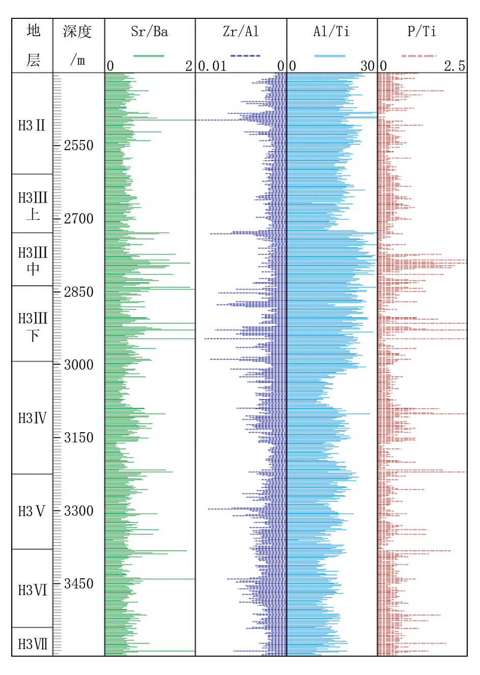 因此, H3Ⅱ 亚段和H3Ⅲ 亚段上、中部有机质含量较高, 这与对应元素录井Al/Ti、P/Ti值相关性良好, 说明通过元素录井资料可以定性判断不同地质时期有机质丰度高低, 为页岩油纵向选层提供更多资料支持。