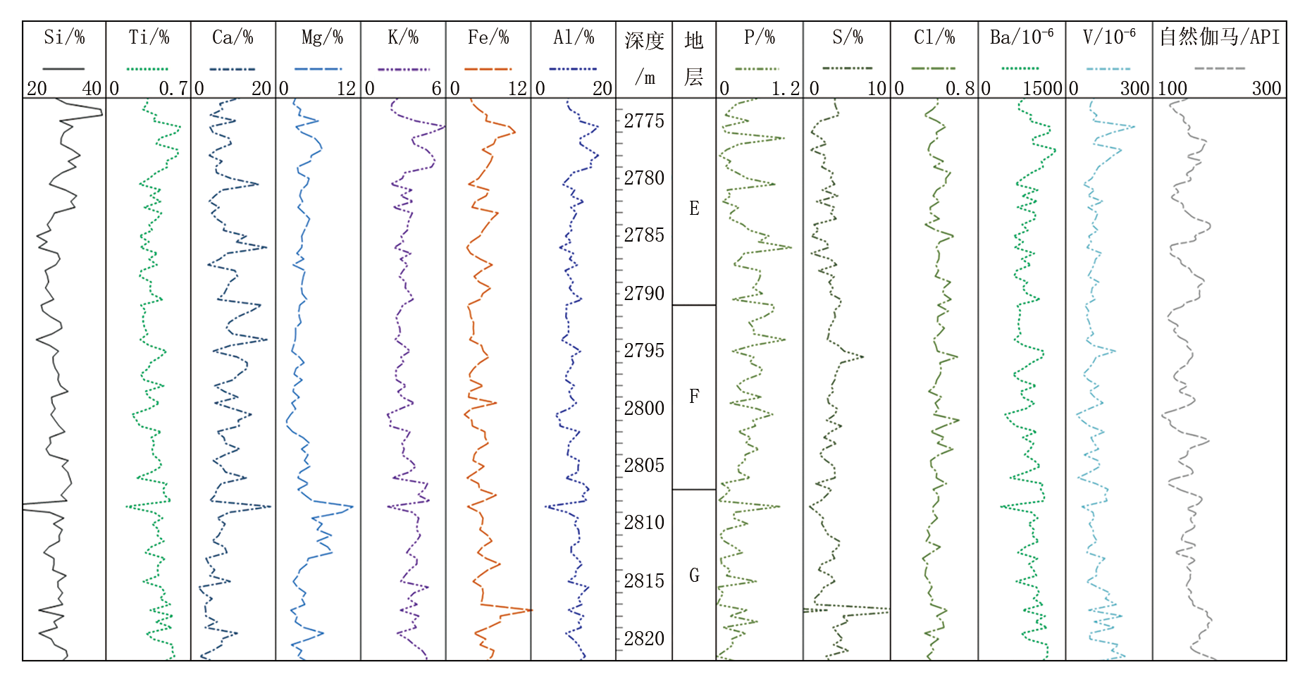 元素录井分析样品能够获得Na、Mg、Al、Si、P、S、Cl、K、Ca、Ti、Ba、Mn、Fe、V、Ni、Sr、Zr等主要造岩元素含量数据, 利用这些数据可以建立元素的含量曲线, 不同曲线包含的地层信息不同, 地质导向利用这些信息进行地层识别对比及井身轨迹调整。