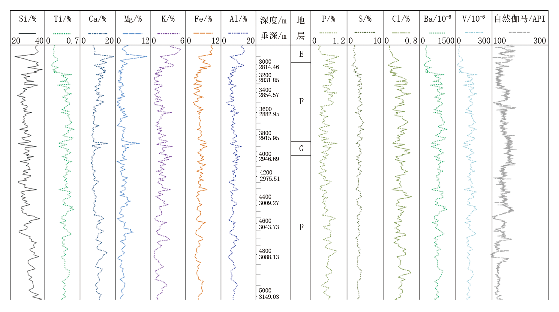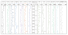 (2)元素录井资料可在页岩油选区、选层、选段方面应用, 主要是基于相关曲线变化结合岩性判断页岩厚度; 通过反映沉积环境的元素比值判断古水深、古生产力, 进而估算页岩体积、有机质丰度等; 通过相关元素曲线及比值变化定性分析岩相、脆性矿物含量, 进而判断地层可压性。