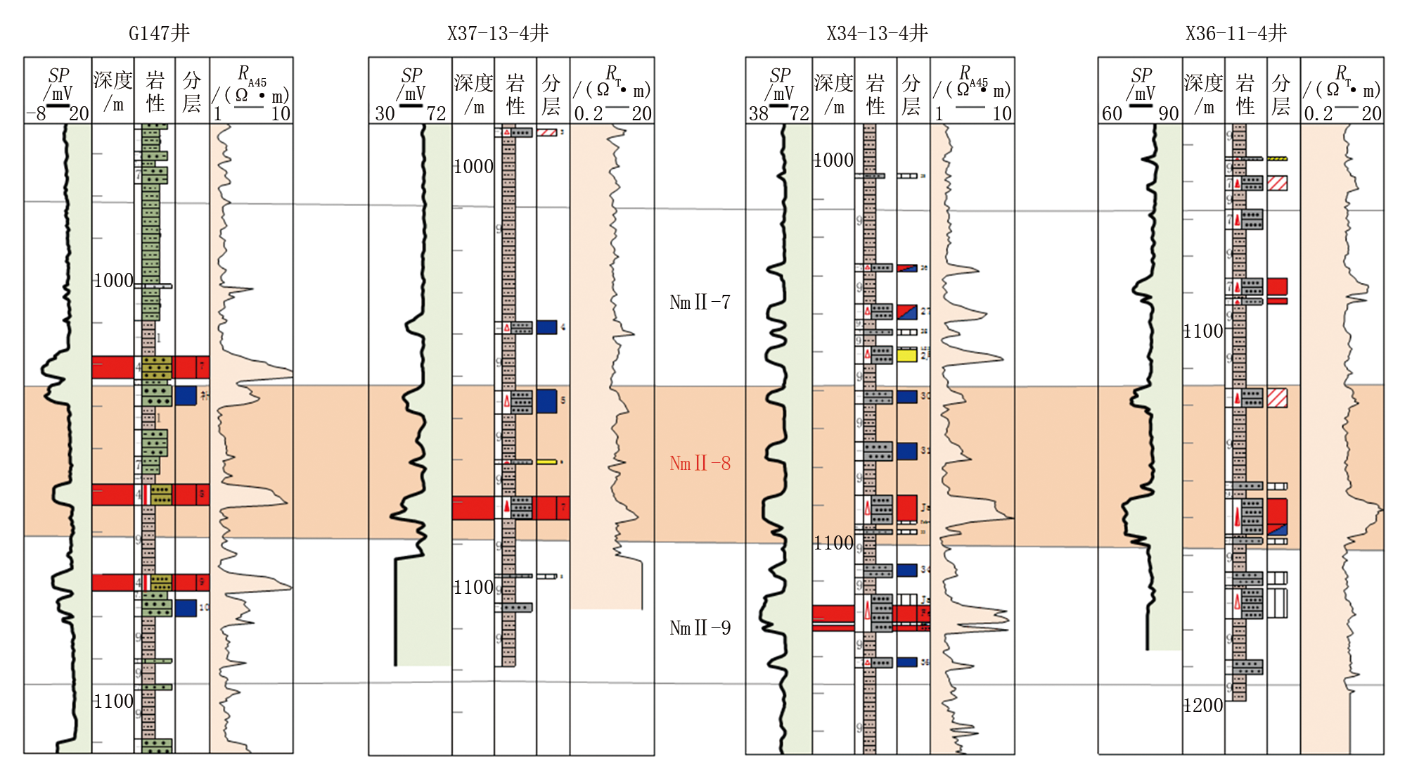 在港北地区完钻层位较浅, 浅层各层段保留地层较全, 基于该区这一构造特征开展井震结合确定各地震层位反射特征及构造格架, 由单井标定到多井联合标定进行地层精细划分和对比, 统一地质地震层位, 即建立井之间的横向特征对比桥梁模型, 能够解决较小幅度构造、砂泥岩薄互层等复杂的地质问题[5, 6, 7, 8]。如图3所示, 橙色区域为目的层NmⅡ -8, 通过井震结合精细地层对比, 精准地完成了G 147井-X 36-11-4井的对比, 解决了由于构造幅度较大造成地层对比难的问题。通过开展井震结合精细地层对比, 统一地质地震层位, 将目的层段拉平, 剔除构造因素的影响, 对沉积现象进行逐层的解释, 进而勾绘出各种地质体和岩性变化。