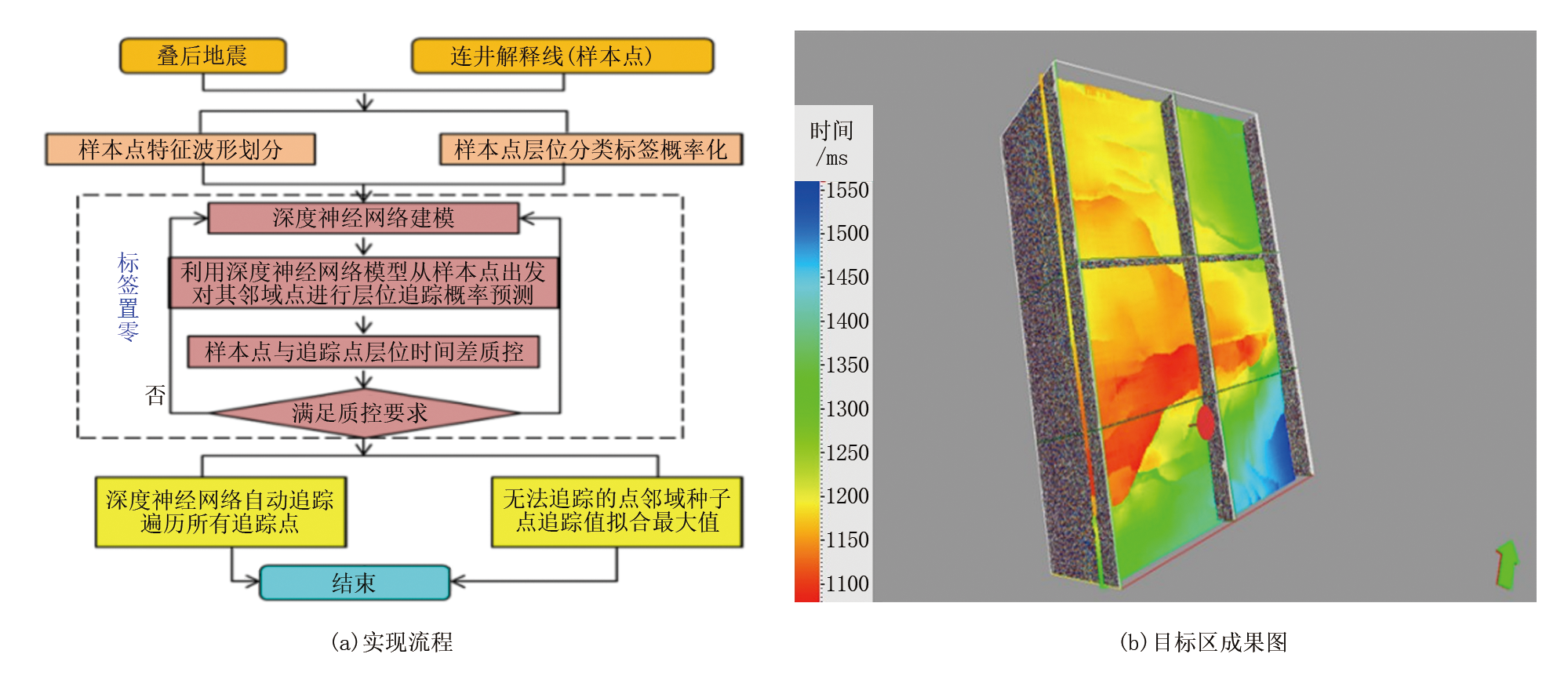 人工-智能解释技术是以样本点特征波形划分以及样本点层位分类标签概率化进行深度神经网络建模, 利用深度神经网络模型从样本点出发对其邻域点进行层位追踪概率预测以及样本点与追踪点层位时间差质控, 通过深度神经网络自动输出追踪遍历所有追踪点, 实现了复杂地质条件下的高精度解释, 确保后续沉积、储层、流体及成藏研究成果精度, 以降低井位实施风险。实现流程见图4a。