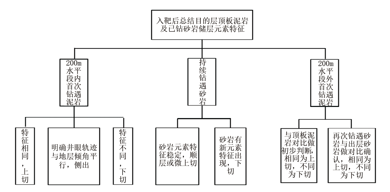 (1)入靶后200 m水平段内首次钻遇泥岩, 因为湖泊相及三角洲前缘相泥岩连续性比砂岩好且元素特征相对稳定, 可以将钻遇泥岩元素特征与入靶点顶部泥岩元素特征做对比。如果特征相同则判断井眼轨迹上切地层顶出, 如果特征不同则下切地层底出; 如果明确井眼轨迹与地层倾角平行, 由砂岩钻遇泥岩, 不管新钻遇泥岩特征是否与顶板泥岩相同均判断为侧出。