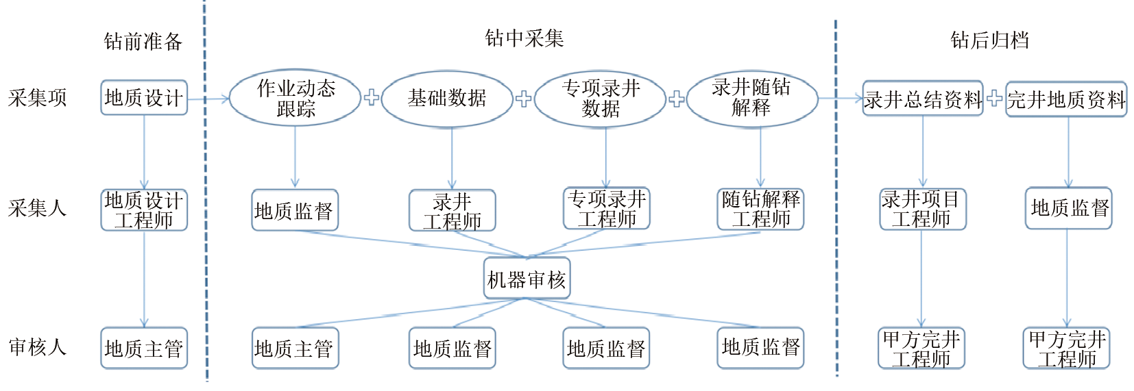 录井数据产生的时间周期跨度大, 采集工作贯穿于整个钻井周期, 既包含钻前设计等静态数据的采集, 也包含钻井过程中众多工程参数等动态数据的采集, 还包含完井后的总结和报告等归档数据的采集, 持续时间周期较长。