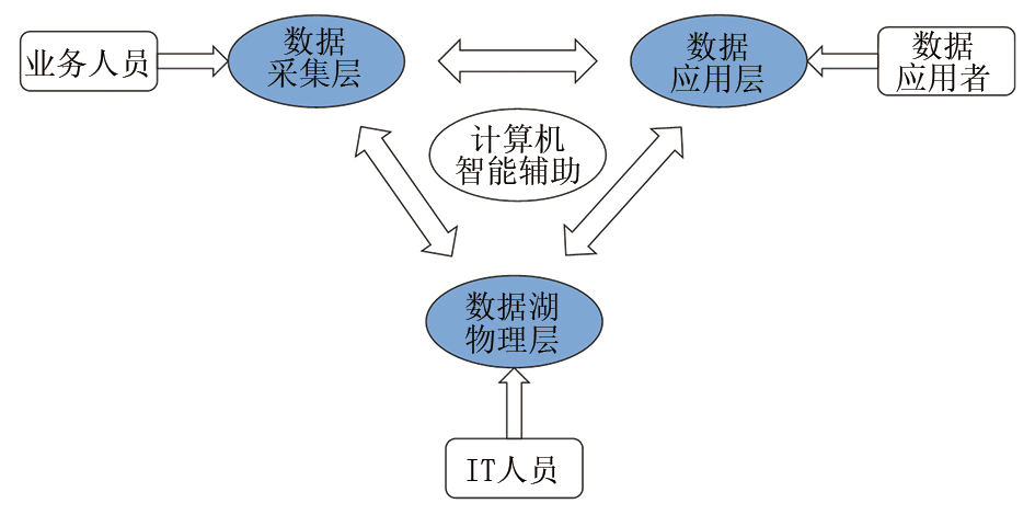 二是数据湖标准模式数据导出。数据采集人员按照数据采集模板, 将数据传至中间数据库再借助计算机的辅助功能完成数据的推送入湖, 当导出数据时, 数据按照设计好的标准数据模式从数据湖中导出, 通过这种模式, 一方面可以对数据湖中的数据进行检查, 另一方面可以在一定程度上满足决策者对信息的需求。但因数据湖中数据是按照计算机系统的逻辑关系进行储存的, 数据往往相对分散, 且需要深度了解计算机系统内部的逻辑关系, 造成数据使用十分不便, 需要进一步优化应用层面数据模板。