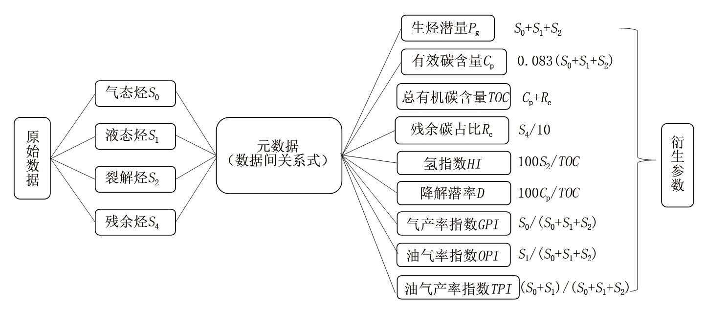 为改变这种状况, 本文重新梳理了数据湖中每个数据项产生的源头及相互间的映射关系, 梳理出数据“ 血缘” 源头, 构建数据采集端模板。以岩石热解录井数据为例, 从原始数据与衍生数据映射关系(图6)可以看出, Pg等衍生参数均由S0、S1、S2、S4这4个基本原始参数计算而来, 因此数据采集人员只需要准确完成原始数据的填写, 其他多张数据表或数据项可直接通过计算机智能辅助进行计算采集, 数据采集数量减少了近90%, 时效提高了近60%。同时, 极大地减少了人工填写内容, 使采集数据的准确性也得到了有效保障。