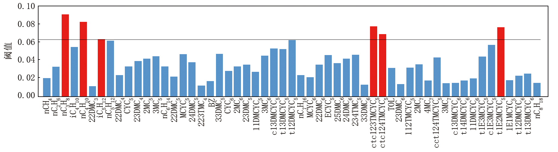 选取渤海油田渤中凹陷西南斜坡带上10口井的地化轻烃敏感参数, 应用ReliefF算法, 选取合适的阈值, 便可得出nC3H8、nC4H10、iC5H12、ctc123TMCYC5、ctc124TMCYC5、t1E2MCYC5共6个参数在区域油气水判别中起主要作用的结论(图9), 有效地指导了区域的油气勘探。