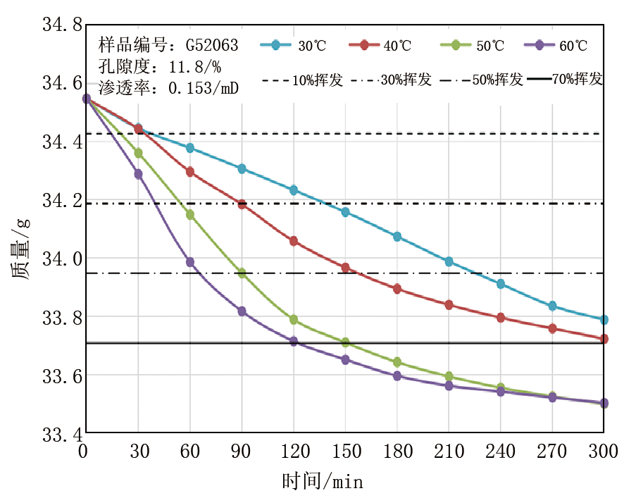 密闭试验又称塑料袋密闭含水试验, 是含气储层含水性识别的常用方法。取岩心中心部位未被钻井液污染的样品, 装入塑料袋(砂样袋)内密封, 通过加热, 将岩心样品内的水分蒸发, 在塑料袋内壁上冷却后凝结成水雾或水珠, 根据袋壁水气状态判断岩心含水情况。密闭试验的两个重要参数是温度和时间, 但在现行标准中均未提及具体方法, 仅在《钻井地质工》[10]中规定将测试岩心样品装入塑料袋密封后置烈日或45~55℃环境下30 min, 参数标准都是根据现场经验获得, 温度和时间合理性有待测定, 观察结果对比性较差, 不利于岩心含水性的判断。