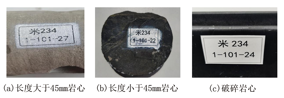 针对传统的岩心编号标识方法耗时长、成本高、岩心长时间存放后编号难以识别的问题, 变更岩心编号格式为“ 取心筒次-本次取心总块数-本块岩心次序” 。该编号方法通俗易懂、不需要跨行或合并单元格, 便于电子资料的录入和调取。同时针对岩心柱面粗糙、易渗透等特点, 首先在岩心表面用自喷漆喷大小为35 mm× 45 mm长方形白色涂层, 目的是降低岩心表面的渗透性, 同时还可以作为岩心编号标识的背景色, 便于分辨岩心颜色。再用手持喷码机将设置好的岩心编号喷印在长方形白漆上。岩心长度大于45 mm时, 岩心标识喷印在岩心左上角(图3a); 岩心长度小于45 mm时, 岩心标识喷印在岩心截面(图3b); 破碎或易碎岩心装入塑料袋, 并加标签, 在岩心盒内相应位置贴上岩心标签(图3c)。通过磨损、防渗、防油防水实验证明, 岩心编号不易磨损、字迹清晰、防油防水、可长时间保存, 同时还具有经济实用、可连续编号、耗时短等优点, 可大幅度提高现场录井的工作效率、降低录井成本。