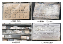每次取完心, 都必须放置岩心卡片(图1)。现行岩心卡片用墨汁在木板上填写或用打印机在白纸上打印岩心出筒信息, 贴在木板上, 再装入塑料袋内, 在本次取心的首、尾各放置一块。卡片内容包括取心筒次、取心井段、进尺、心长、收获率等信息, 便于岩心管理。但是在现行标准中均未对岩心卡片大小、呈现方式及包含信息提出具体要求, 另外该方法主要有4个缺点:操作繁琐、耗时长(图1a); 防水性差, 卡片内一旦进水, 会导致字迹模糊无法辨认(图1b); 由于卡片放置在岩心盒内, 无法固定, 在运输和观察岩心时容易混乱或者丢失(图1c); 承载信息量少, 只有取心级别信息, 没有岩心油气水观察试验信息, 不利于地质技术人员观察和研究岩心(图1d)。