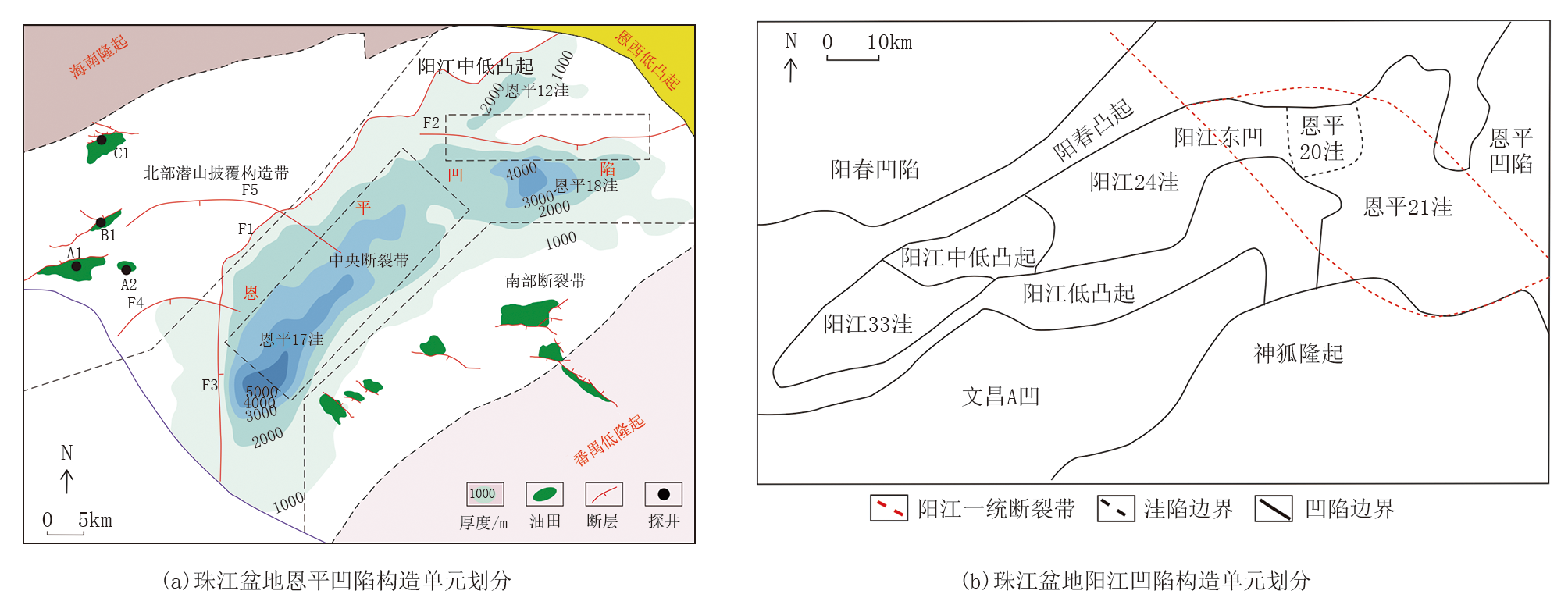 阳江东凹位于珠江口盆地珠一坳陷和珠三坳陷的交会处, 处于阳江一统大走滑断裂带之上, 北部毗邻海南隆起和阳春凸起, 东接恩平凹陷, 南接阳江低凸起和神狐隆起, 洼陷呈NE走向[2, 4](图1b)。阳江东凹经历了晚白垩世-早渐新世断陷阶段、晚渐新世-中中新世拗陷阶段和晚中新世至今的新构造运动阶段。阳江东凹内从下到上地层依次为始新统文昌组和恩平组, 渐新统珠海组, 中新统珠江组、韩江组、粤海组, 上新统万山组及第四系[2, 14]。文昌组、恩平组为主要烃源岩, 珠海组、珠江组及韩江组下段为主要储层(图1b)。