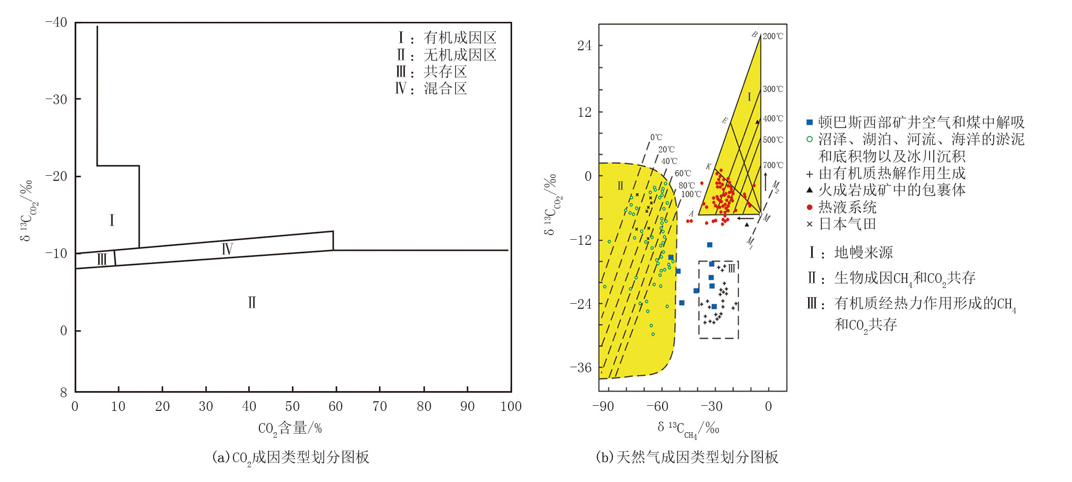 CO2成因主要有无机成因和有机成因两大类:无机成因CO2可分为幔源岩浆脱气作用成因、地壳岩石熔融脱气成因和壳源碳酸盐岩热分解作用成因; 有机成因CO2是沉积有机质在热演化过程中伴随烃类气体生成的, 煤和干酪根热解是CO2有机成因的主要来源。在沉积有机质煤化过程中, 纤维素在泥炭化和腐殖煤转化的过程中产生CO2[1, 15, 16, 17, 18]。而CO2在形成过程中继承了其母源物质及形成时的地质地球化学信息[7], 不同的
