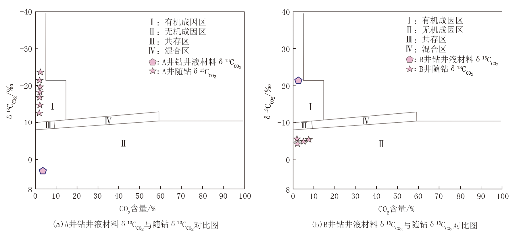 因为钻井液材料生成气体主要为CO2, 所以主要使用CO2成因类型划分图板。A井随钻
