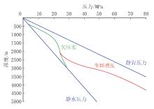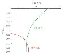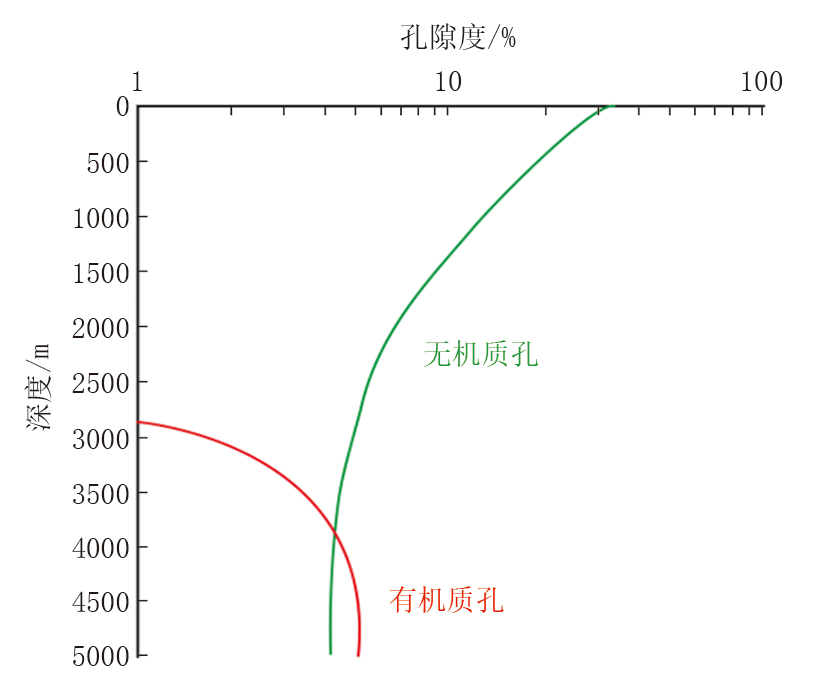 引用的相关理论是在一定的时代与技术背景、地质与工程条件下产生的, 随着背景及条件的变化, 在应用过程中可能会出现先进性、适用性不足等情况, 此时就不宜生搬硬套, 而是要与时俱进, 通过资料的分析, 深化所沿用的理论, 提高其先进性、适用性。如地层压力预监测广泛采用的欠压实原理, 是基于Terzaghi和Peck所构建的孔板与弹簧模型建立起来的, 适用于泥页岩地层[29]。Ozerskaya给出了岩石孔隙度随埋深增加呈指数式降低的关系式, 表明地层不能被无限压实[30]。从常规油气到非常规油气, 随着深度、温度、热演化程度的增加, 无机质孔减少, 有机质孔增多(图1)[24], 欠压实原理的前提条件发生了变化, 适用性变差甚至不再适用[31, 32, 33]。张善文等[34]提出, 东营凹陷的异常高压在1 000~2 500 m之间以欠压实作用为主, 而在2 500 m以深则以生烃作用为主(图2)。从中浅层到深层、超深层, 原生孔隙减小、次生孔隙增多, 岩性及孔隙类型、压力成因及温压系统都变得更加复杂, 欠压实理论及趋势线选定的方法也不再适用[35, 36]。这都需要在欠压实理论的基础上对地层压力预监测理论进行深化, 提高复杂储层多源成因地层压力预监测的精度[37]。