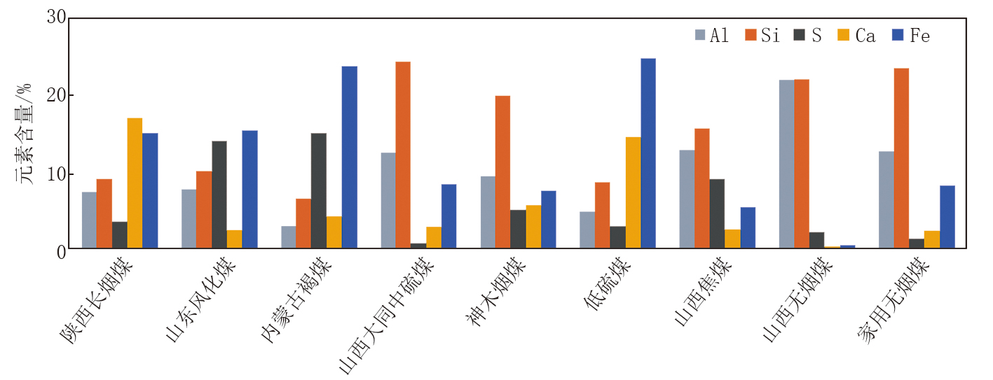 为明确煤中主要元素含量, 本次研究采集陕西长烟煤、山东风化煤等9种不同类型煤岩样品开展元素分析。结果表明, Al、Si、Ca、Fe、S为煤中主要元素, 其中S元素平均含量达7.56%(图1)。