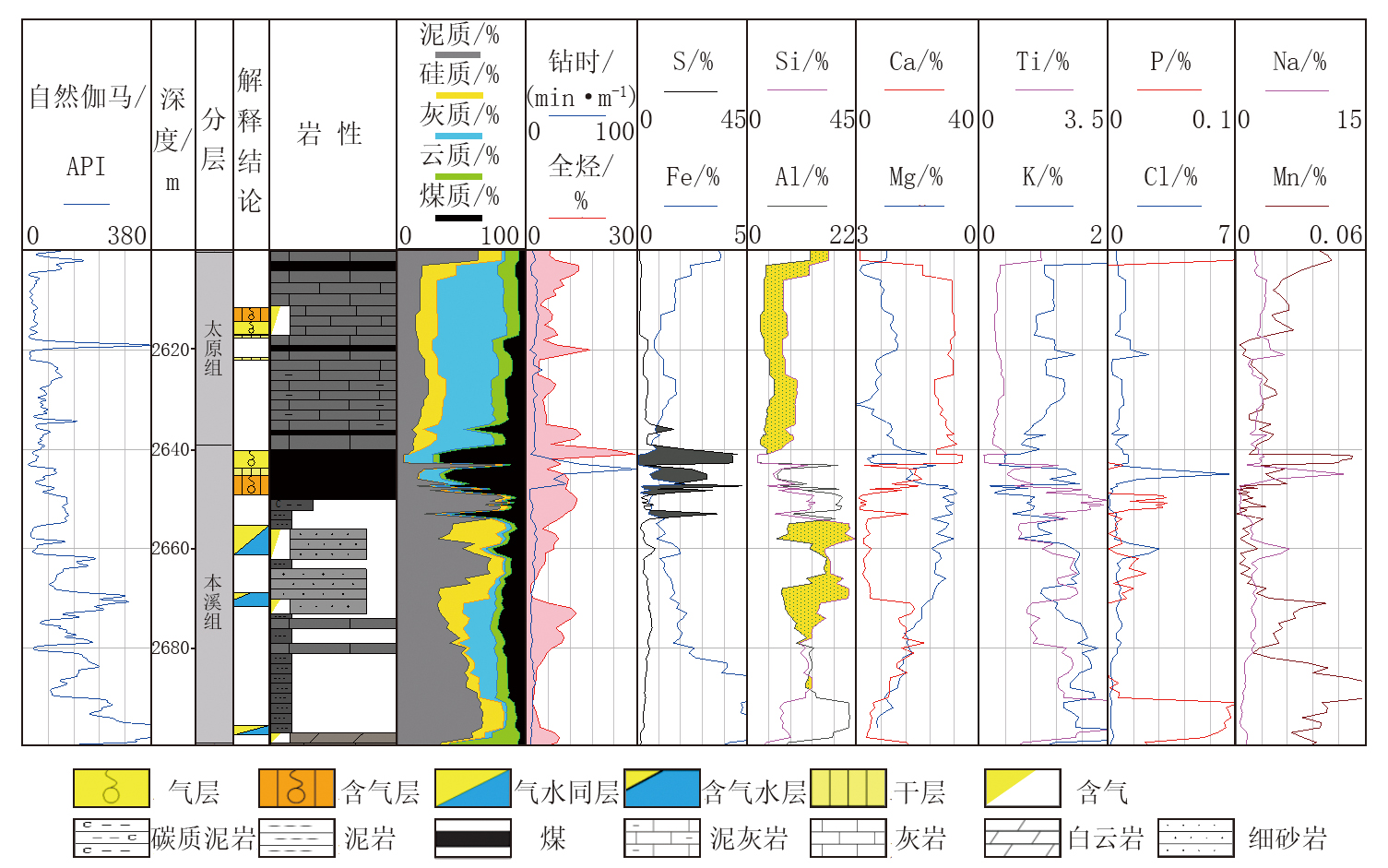 试气井的数据统计显示, 煤系储层泥质含量直接影响储层物性, 进而对产气量产生重要影响。因此, 岩性判别与泥质含量确定具有关键意义。统计表明, 鄂尔多斯盆地煤系储层岩性主要包括碳质泥岩、泥岩、灰岩、细砂岩、煤等6种。基于这些岩性中矿物对应的特征元素, 以及通过黏土矿物、碳酸盐矿物、硫化物等对应的12种特征元素组合曲线的包络特征及趋势变化, 可实现岩性判别(图2)。