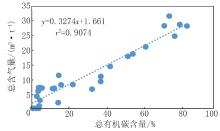为量化总有机碳含量与总含气量的关系并实现对储层总含气量的有效预测, 本研究统计了已钻井深层煤岩气储层保压取心的30个样品点测试数据, 深入分析了总含气量与岩石总有机碳含量之间的相关性, 据此建立了基于总有机碳含量的线性回归模型用于预测总含气量(图4)。