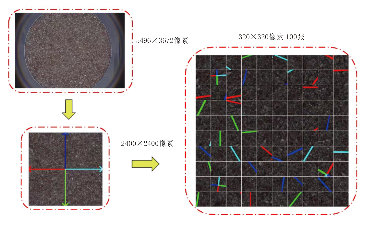 数据扩增主要通过裁剪、平移、旋转和缩放等操作实现[8, 9]。在大多数情况下, 岩屑图像的采集具有固定性和分布均匀的特点。针对用于模型训练的原始岩屑图像数量较少的情况, 可先对岩屑图像进行裁剪处理, 构建更具多样性的数据集以满足后续训练需求。具体过程如图7所示, 岩屑图像的像素为5 496× 3 672, 图像中岩屑边缘部分容易因为现场操作失误出现岩屑未铺满从而导致漏出托盘底色的情况, 因此先对中间圆形区域取像素为2 400× 2 400的内接正方形, 以保证所截取区域内无托盘背景干扰, 使得视野内皆为岩屑。在2 400× 2 400像素的岩屑图片中进行随机裁剪, 随机裁剪得到小图依旧是均匀分布的, 可以从局部反映整体岩屑的岩性。但若裁剪尺寸过小则无法具有足够特征从而达不到反映整体图像的作用, 且因具有较大的偶然性, 可能会引入假岩屑而不利于模型的学习。经过多轮模型训练与效果对比, 最终确定采用像素为320× 320的岩屑小图作为模型输入, 图7中2 400× 2 400像素岩屑图片的4条箭头方向标识是为了更好地看出经过图片扩增后的岩屑小图与原图的对应位置。首先计算出安全区域(即确保缩放旋转等操作后不裁剪到边缘黑边), 得到安全区域边界为([r, 2 400-r], [r, 2 400-r])。
