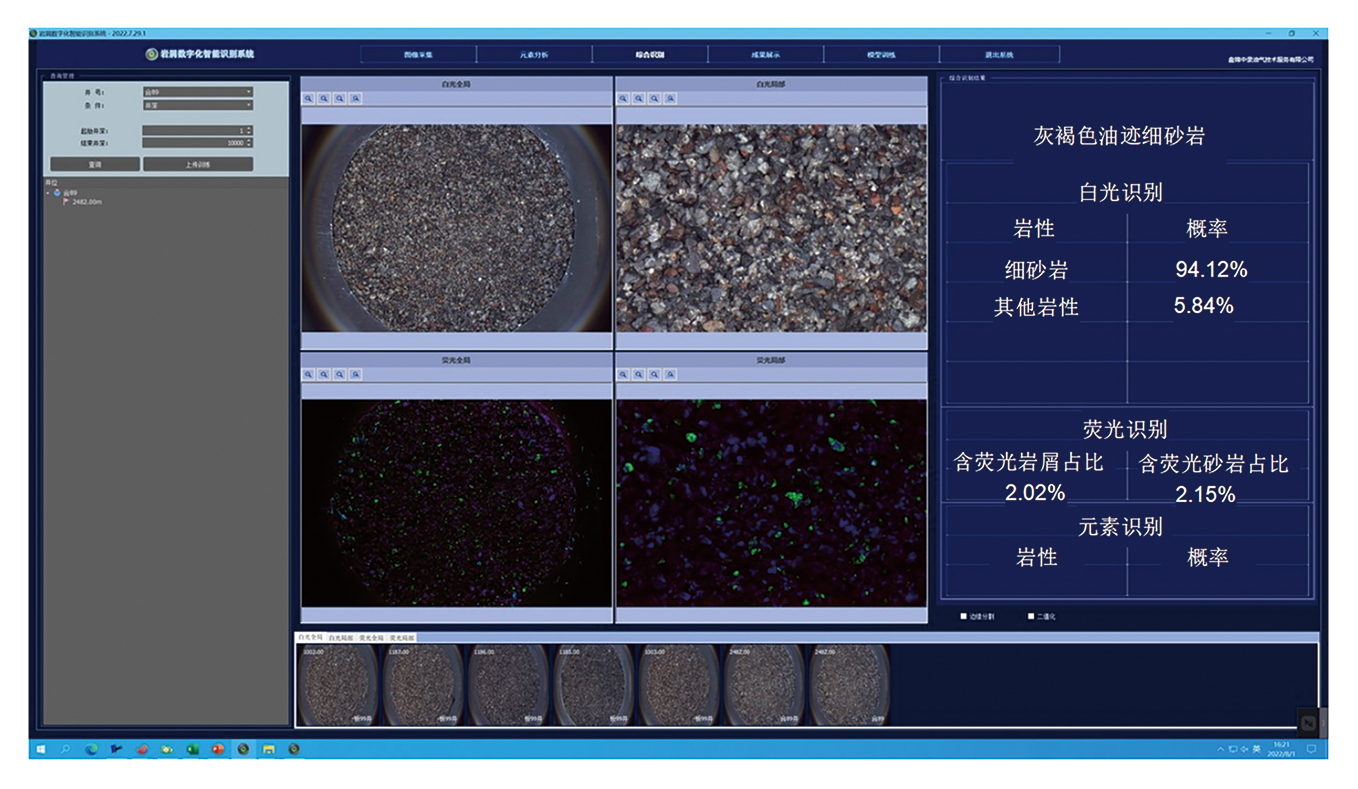 此外, 软件还支持白光与紫外条件下大视野和小视野图像的合成显示。系统通过深度学习模型实现对岩性的准确识别, 还可集成元素分析技术, 快速获取样品的主量元素及微量元素组成与含量信息, 结合图像分析手段, 为特殊岩性的辅助识别提供数据支撑, 全面提升岩屑智能识别的准确性与实用性。