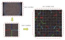 在安全区域内随机选取一个点作为旋转中心C; 由于岩屑摆放无固定方向要求, 旋转角度A在[0° , 360° ]范围内随机选取; 同时, 缩放系数S在[0.8, 1.2]之间随机选取, 该区间范围根据岩屑颗粒大小不均的实际情况确定。随后, 利用选定的C、A和S对原始2 400× 2 400像素图像进行仿射变换, 令α =ScosA, β =SsinA, 生成对应的仿射变换矩阵