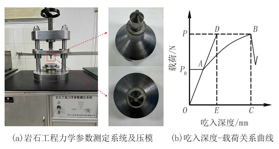 静载压入实验采用的是岩石工程力学参数测定系统, 如图1a所示, 可选择恒压或恒速率加载, 连续记录吃入深度-载荷关系曲线(图1b), 进而完成岩石硬度和塑性系数测试。