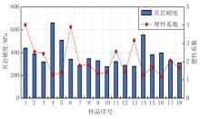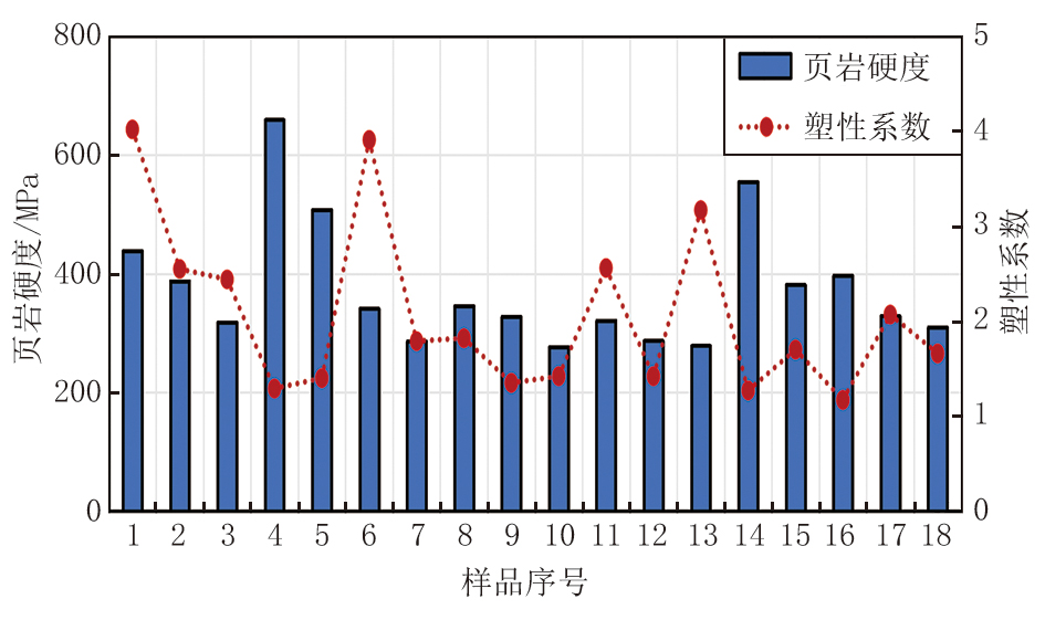 页岩硬度和塑性系数实验结果如图2所示。页岩样品的硬度主要分布在278.6~659.4 MPa之间, 塑性系数主要分布在1.17~4.02之间。