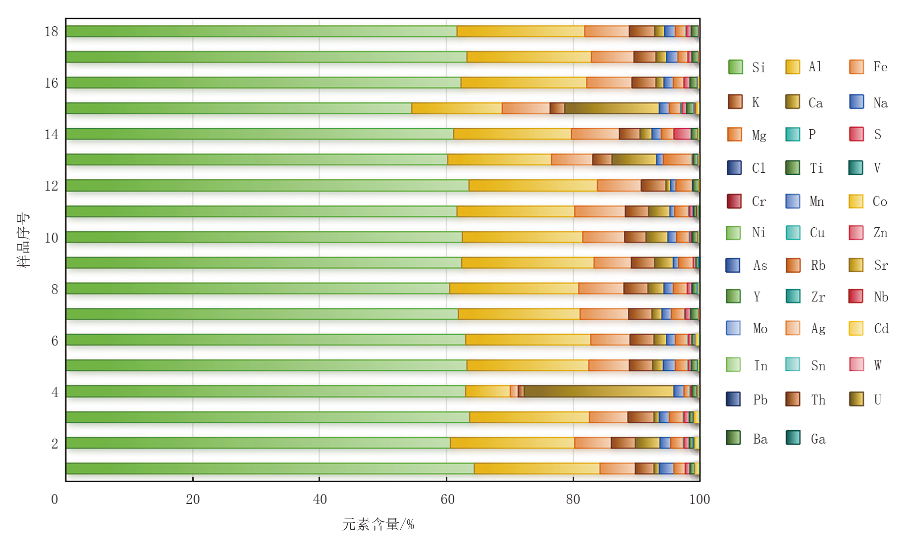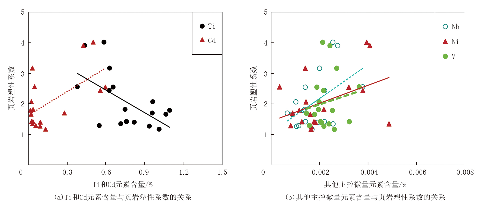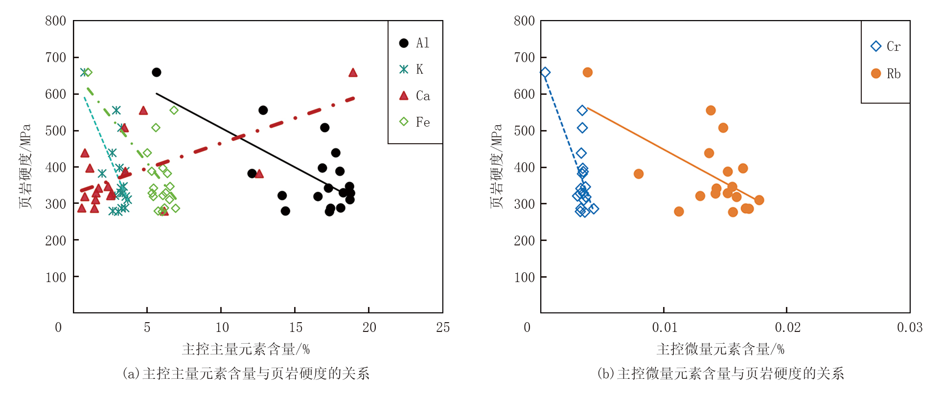 页岩硬度与元素的皮尔逊相关系数绝对值分布介于0.090 7~0.923 5之间, 主控的主量元素依次为Fe、Al、K、Ca, 主控的微量元素依次为Cr、Rb; 塑性系数与元素的皮尔逊相关系数绝对值分布在0.003 9~0.701 9之间, 主控的主量元素为Ti, 主控的微量元素依次为Cd、Nb、Ni、V。