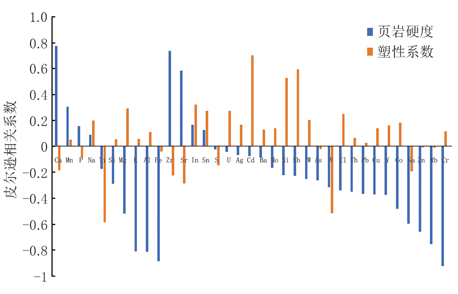 皮尔逊相关系数值介于-1到1之间, 绝对值越接近1, 表示两个变量之间的线性关系越强; 绝对值越接近0, 表示线性关系越弱。页岩硬度和塑性系数与元素的皮尔逊相关系数计算结果如图4所示。