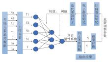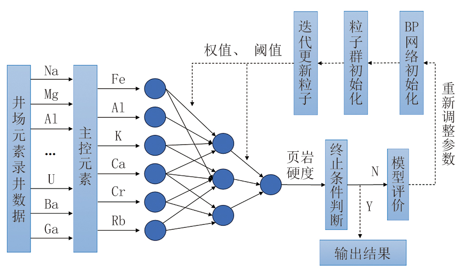 基于录井元素和页岩硬度实验数据集, 将元素作为输入变量, 页岩硬度作为输出目标, 考虑初始权重和阈值对BP神经网络算法稳定性和精度的影响, 构建粒子群优化的BP神经网络(PSO-BP)算法的页岩硬度智能预测模型, 只选取页岩硬度的主控元素Fe、Al、K、Ca、Cr、Rb作为输入变量, 建立了页岩硬度PSO-BP神经网络预测模型, 如图7所示。