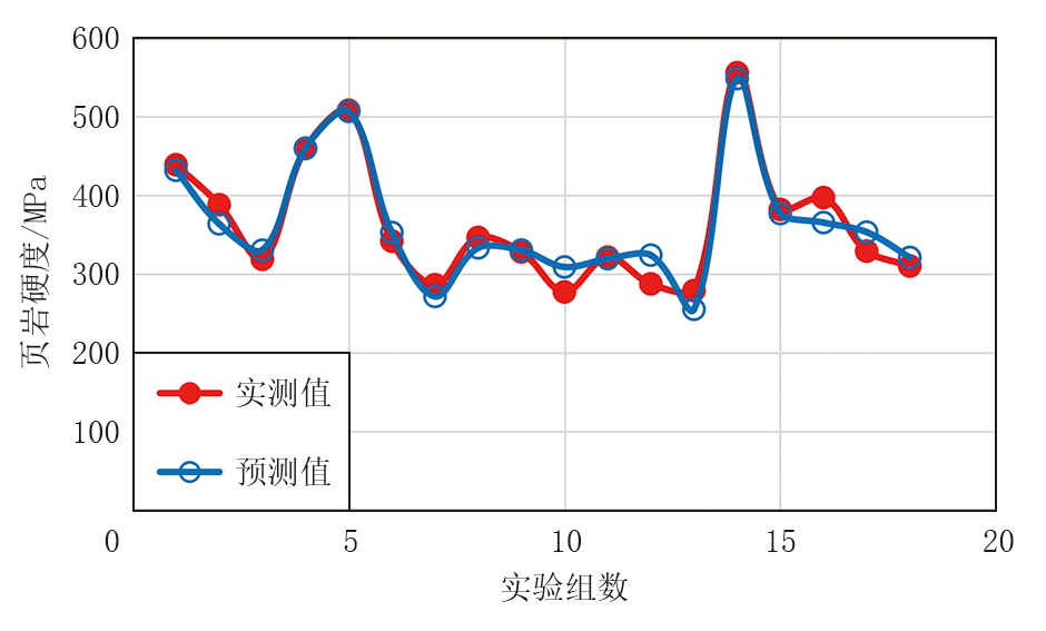 在模型训练过程中, 首先初始化粒子群, 每个粒子代表在网络的一组权重和阈值。利用前向传播计算每个粒子对应的网络误差, 并通过个体和全局误差的比较, 找到个体历史最优误差和全局最小误差。基于这些最优值, 利用粒子群更新粒子的速度和位置, 优化网络的权重和阈值。随后, 通过BP神经网络的反向传播对优化后的权重和阈值进一步调整, 再将优化结果代入训练集, 计算误差并评估网络性能, 若误差小于预设阈值(1× 10-7)则停止训练。在本研究的BP训练阶段, 学习率设置为0.01, 模型的预测结果如图8所示。