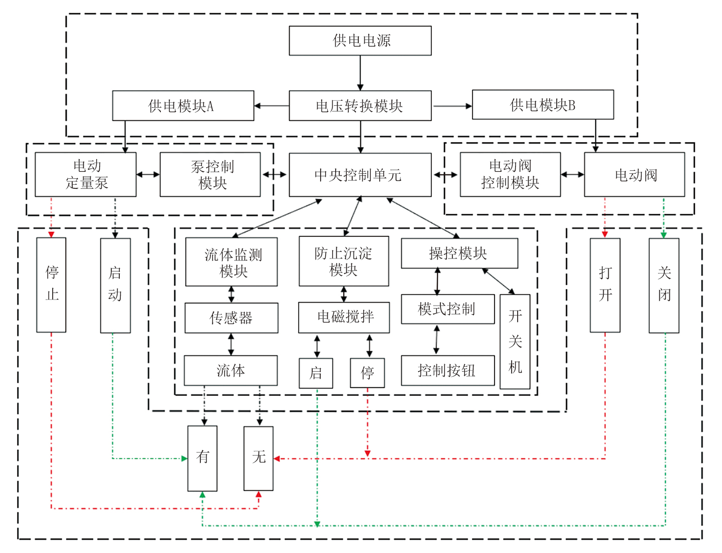 中控指令模块的芯片内部固定植入逻辑程序, 逻辑程序对各数据进行分析对比, 并根据对比结果, 运行相应逻辑程序控制对应单元及模块工作; 信号采集模块采集流体感应传感器、录井仪流量参数及按钮开关信号; 分析处理模块将电阻信号转换为数字信号传输给中控指令模块; 定量泵控制模块根据中控指令模块给出指令, 驱动定量泵启停和钻井液流量调节; 自动排砂控制模块主要驱动电动阀和防沉淀电磁搅拌器, 根据中控指令模块给出指令, 控制电动阀的启停、开合程度或防沉淀电磁搅拌器的启停。