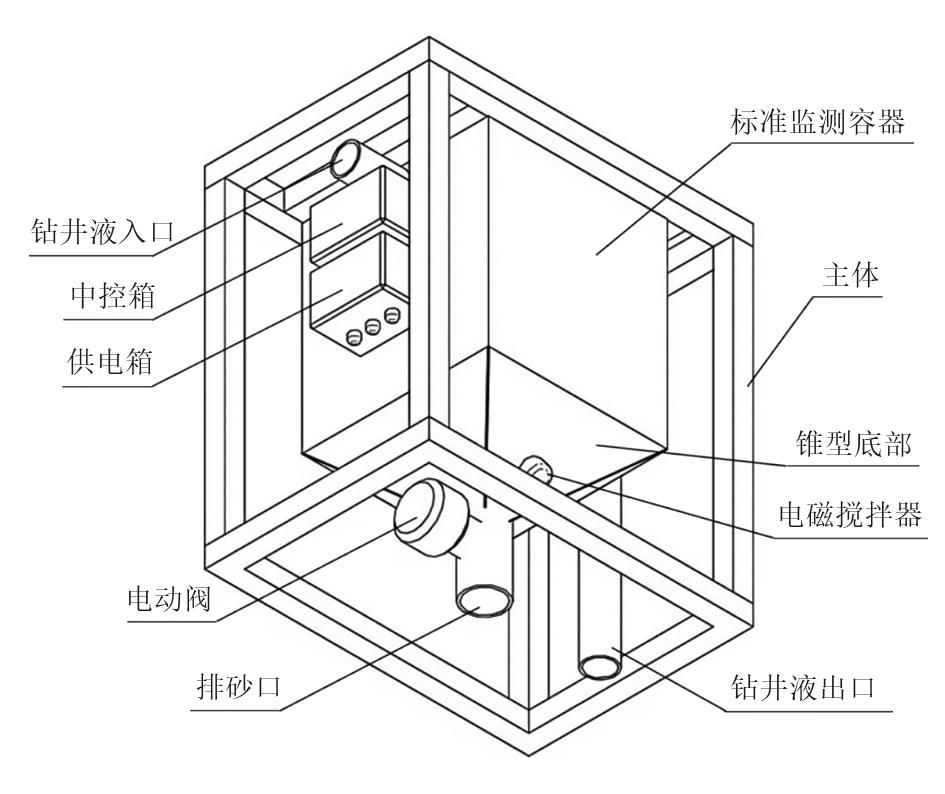含标准容器(长450 mm, 宽450 mm, 高600 mm)及传感器。容器右侧上方为钻井液入口, 左侧为出口(弯管垂直延伸至底部), 出入口均安装流体感应传感器并与中央控制单元通信。各传感器长度改进为550 mm, 其余参数不变。