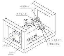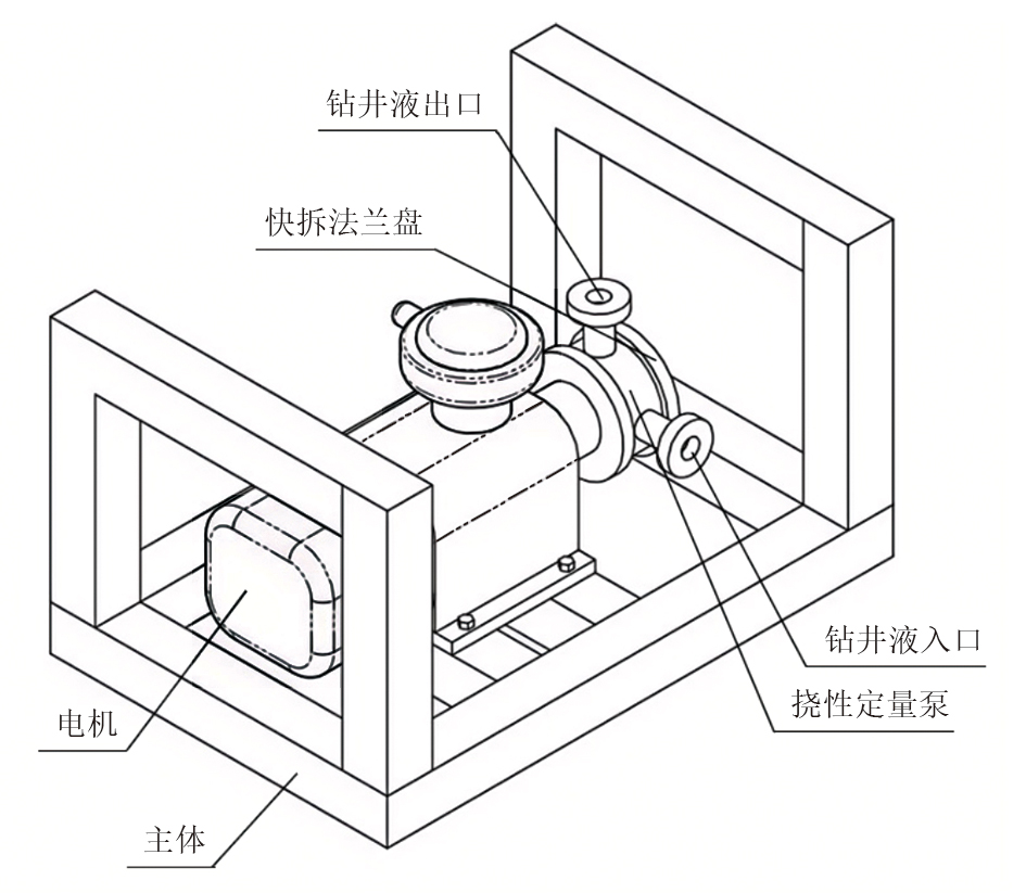 由防爆电机(DC24 V, 370 W)、挠性定量泵(304不锈钢主体, 丁腈泵芯, 具自吸功能, 流量0~15 L/s可调, 最大通过颗粒直径15 mm; 最大通过流体密度为3.0 g/cm3等)及进出口高压软管组成(图3)。进口高压软管带过滤网, 与缓冲罐钻井液入口相连, 出口高压软管与定量监测标准容器入口连接。泵接口为快拆卡箍式法兰盘, 泵的启停和流速由中央控制单元控制。