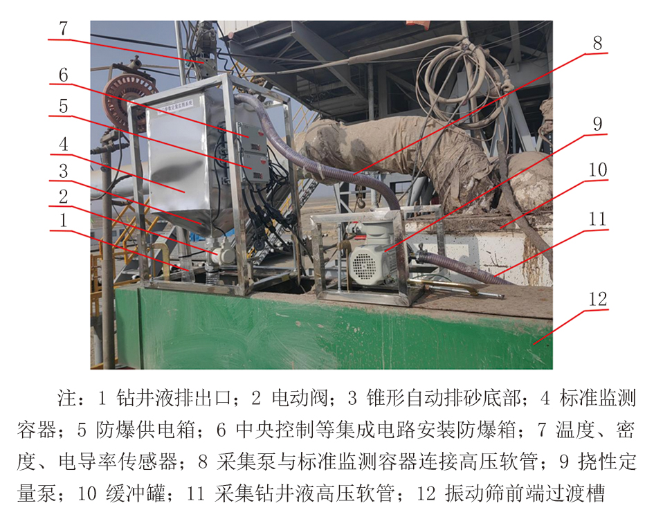 定量监测主体和定量采集主体用G型卡子四角固定在振动筛前端过渡槽上方, 钻井液排出口和排砂口对准过渡槽开口。定量采集泵入口管线伸至缓冲罐钻井液入口处, 出口管线与定量监测单元入口连接。温度、密度和电导率传感器以三角形结构(间距300 mm)垂直安装在标准容器内, 信号及供电线路与录井仪采集模块连接。