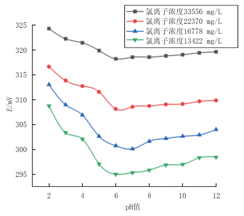 在恒定温度下, 选取磷酸作为调节待测溶液pH值的缓冲溶液, 分别调节浓度不同氯离子溶液的pH值, 并获得离子选择电极输出值, 观测被测溶液pH变化对氯离子电极输出值的影响, 结果如图2所示。保持氯离子浓度不变, 则电极的输出值随着pH值的变化而相应变化, 表明被测溶液pH值变化直接影响氯离子选择电极。