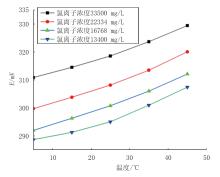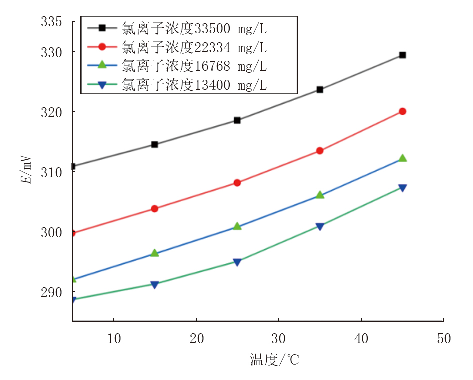 以氯离子选择电极为例, 配制4组标准溶液, 分别改变不同浓度溶液的温度, 保持pH不变, 采集输出离子电势值, 即可获得4组标准浓度下氯离子电极输出值和温度之间的关系, 如表3所示。