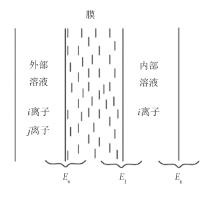 式中:E0为初始电势; R为气体常数; T为绝对温度; F为法拉第常数; zi和zj为离子i与j的电荷数; ai为i离子在外部溶液中的浓度; aj为j离子在溶液中浓度。