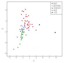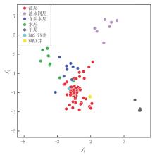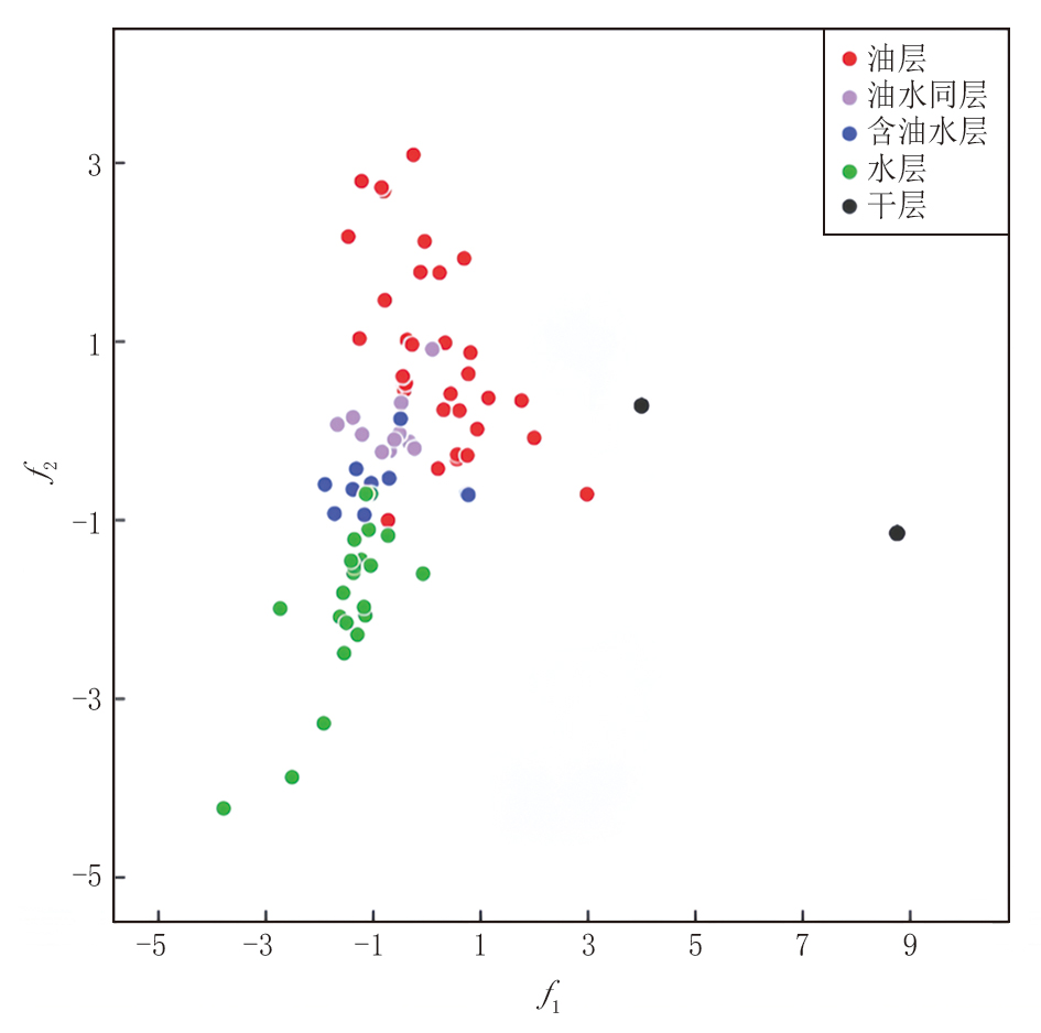 将研究区储层样本的关键参数分别代入f1、f2判别函数中计算两个函数值, 通过建立两个判别函数(f1、f2)可实现二维有效分类, 据此以f1为横轴, f2为纵轴, 绘制解释评价图板。不同流体类别的样本会形成不同的聚集区, 以此确定流体性质边界, 再根据样本在二维坐标系中的位置, 判断其属于油层、油水同层还是水层, 从而实现直观、准确的流体识别。该方法结合统计学与机器学习理论, 不仅可有效提高储层流体识别的准确性, 还为储层流体性质评价提供了可靠的定量依据。