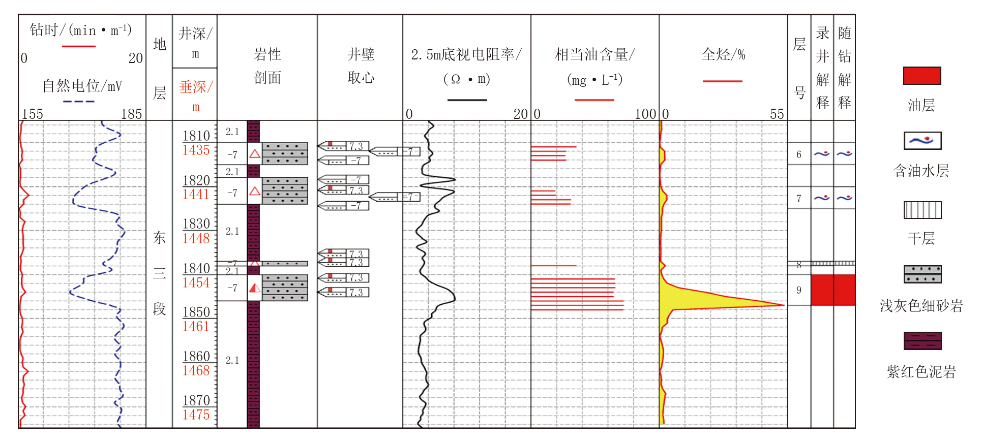 经对井段1 842.4~1 847.8 m进行试油(录井解释9号层), 采用射流泵排液工艺, 产油2.67 t/d, 原油密度0.916 4 g/cm3, 粘度220 mPa· s, 录井随钻解释结论与试油结果吻合。