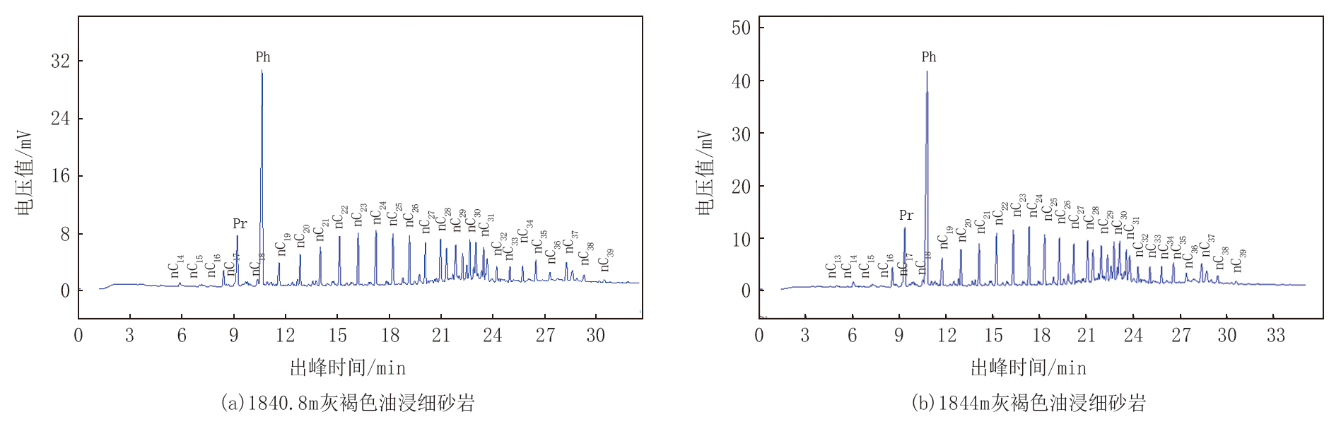 录井解释9号层(1 840~1 847 m)表现突出:岩性为浅灰色油迹细砂岩, 全烃曲线峰型利落无拖尾, 最高为53.57%, 烃组分齐全, C1相对含量为98.23%; 随钻岩屑岩石热解Pg值3.14~3.3 mg/g, TPI值0.235~0.239; 三维定量荧光相当油含量64.22~72.25 mg/L; 在随钻综合解释评价图板中投点落于油层区域(图2), 解释为油层。完钻后井壁取心2颗均为油浸显示, 滴水缓渗; 壁心岩石热解Pg值45.00~50.41 mg/g, TPI值0.389~0.406; 气相色谱欠饱满但烷烃峰较齐全(图4), 碳数范围nC13-nC39, Pr/Ph为0.17, 相对峰面积309~570。结合壁心及其各项分析化验资料综合解释9号层为油层。