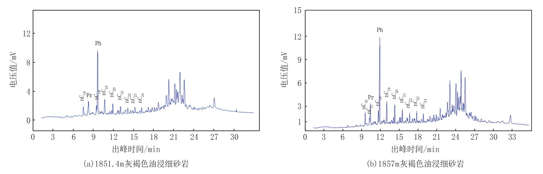 录井解释16、17号层(1 849~1 852 m、1 855~1 861 m)表现突出:岩性为浅灰色油迹细砂岩, 全烃曲线峰型较饱满, 最高为68.97%, 烃组分不全, 缺少C2, C1相对含量为99.00%; 随钻岩屑岩石热解Pg值4.4~5.4 mg/g, TPI值0.302~0.422; 三维定量荧光相当油含量48.52~75.06 mg/L; 在随钻综合解释评价图板中投点落于油层区域(图2), 解释为油层。完钻后井壁取心5颗均为油浸显示, 滴水缓渗; 壁心岩石热解Pg值20.46~24.63 mg/g, TPI值0.422~0.478; 气相色谱基线部分隆起(图6), 烷烃峰不齐全且呈现生物降解形态, 峰形低平甚至消失。结合壁心及其各项分析化验资料综合解释16、17号层为油层。