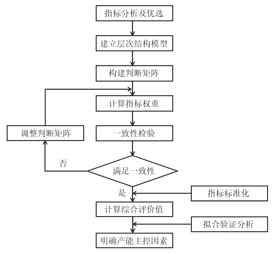 针对红星地区吴家坪组气藏储层, 综合不同类型、不同值域参数, 以井点实钻数据为依据, 构建定量评价体系, 全面开展产能主控因素评价。评价技术路线(图2)如下:①在综合分析气藏地质特征和工程技术改造方案的基础上, 优选评价指标; ②将影响因素进行分类筛选, 通过条理化、层次化归类, 建立层次结构模型; ③在评价指标标准化的基础上, 构建判断矩阵并确定指标权重; ④进行因素排序及一致性检验, 若满足一致性, 则对评价指标进行标准化, 并计算综合评价值; 反之调整判断矩阵, 重新计算指标权重并进行一致性检验; ⑤对综合评价结果拟合分析, 验证其可靠性, 进而明确产能主控因素。