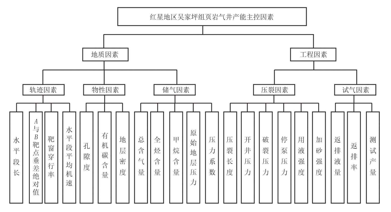红星地区吴家坪组页岩气井产能受多重因素影响, 总结该地区气藏地质特点及建产效果, 结合调研文献[17, 18]发现, 气井产能主要受地质因素和工程因素影响。因此, 将两者作为一级评价指标, 其中, 地质因素分为轨迹因素、物性因素和储气因素3个二级指标; 工程因素分为压裂因素和试气因素2个二级指标。各二级指标又分为水平段长、总含气量、压裂长度、返排液量等21个三级指标(图3)。