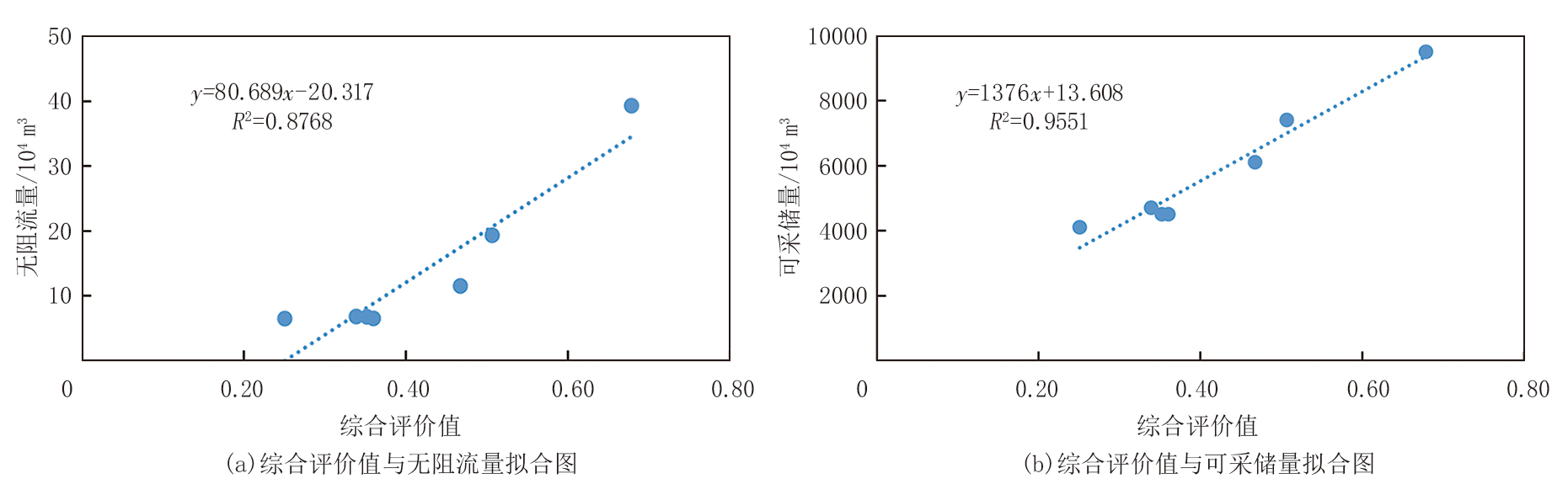 无阻流量和可采储量可以作为反映气井产量效果的参数[17], 通过气井实际的无阻流量和可采储量检验层次分析评价值的准确性, 利用这2个参数分别与气井计算出的综合评价值(F)进行拟合(图4), 判断评价值可靠性。从图4发现, 本文计算的综合评价值与无阻流量拟合度R2为0.876 8, 与可采储量拟合度R2为0.955 1, 说明拟合效果好, 即随着综合评价值增大, 无阻流量和可采储量也增大。本文层次分析法算出的综合评价值可反映气井生产能力, 计算出的产能影响因素可信度高。