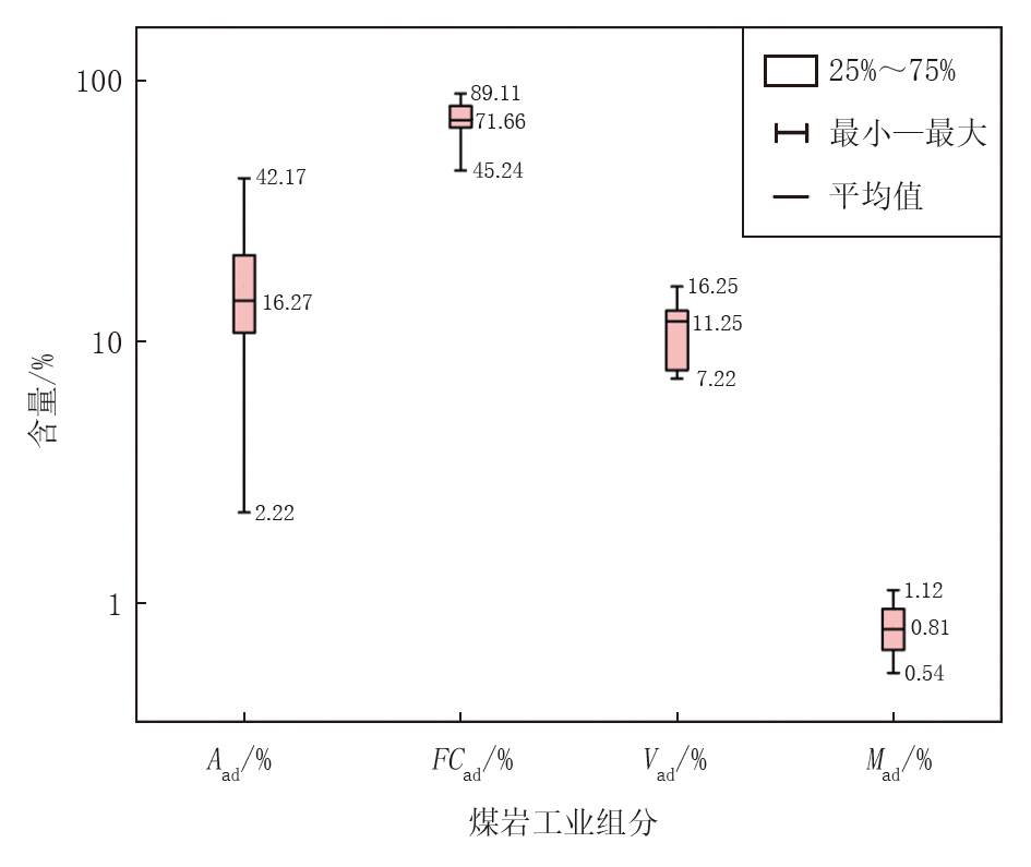 煤的工业分析是评价煤质特性的基础, 根据国标GB/T 212-2008《煤的工业分析方法》和GB/T 30732-2014《煤的工业分析方法 仪器法》中煤的工业组分规定, 水分、灰分和挥发分含量是直接测定, 而固定碳含量是根据差减法计算得出, 即FCad=100%-Mad-Aad-Vad[34, 35]。这些工业组分的含量不仅决定了煤的工艺性质, 还与煤岩气的赋存状态和开发潜力密切相关, 是评价煤岩气的基本依据。