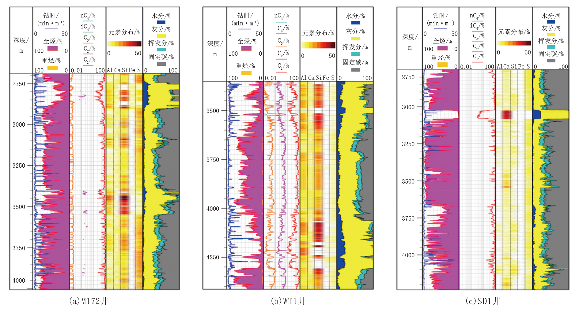 元素录井主要是采用钻井岩屑样品进行元素含量分析, 岩屑中混有钻井液, 采集过程中需要进行水洗, 因此挥发分含量不能用高温干馏法测定, 水分含量也不能通过干燥失重法测定。高挥发分煤在热解过程中可能生成更多烃类气体, 在相同钻井条件下表现为高气测值; 水分会占据煤岩孔隙空间, 抑制甲烷吸附, 降低有效含气量, 在相同钻井条件下表现为低气测值。因此, 引入气测全烃对煤岩挥发分和水分进行定量计算。