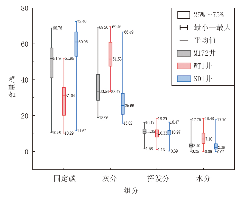 根据表1分析测试结果(剔除M 172-1、M 172-2样品数据)可以得到煤岩工业组分分布箱线图, 如图1所示。分析结果显示, 灰分(Aad)含量2.22%~42.17%, 平均16.27%, 变化范围较大, 反映了成煤过程中古地理环境的动态变化。如表1所示, SD 1井部分样品(如SD 1-2-1至SD 1-2-6)灰分含量(2.22%~5.77%)显著低于其他样品, 表明其形成于相对稳定的泥炭沼泽环境, 碎屑矿物输入较少。而M 172-8和WT 1-5-2-2样品灰分含量高达42.17%和39.22%, 暗示沉积期可能存在频繁的水动力扰动或陆源碎屑输入, 导致同生矿物含量升高。固定碳(FCad)含量45.24%~89.11%, 平均71.66%, 其与甲烷吸附量呈显著正相关:高固定碳通常对应高阶煤, 热演化程度高, 微孔发育, 利于气体吸附; 而低固定碳可能为中低阶煤, 吸附能力较弱[1], 这与刘广景等[30]提出的“ 镜质组含量与吸附能力正相关” 结论一致。并且, 灰分含量与固定碳含量呈显著负相关(R2=0.96), 如SD 1-2-3样品灰分含量仅2.22%, 固定碳含量高达89.09%, 对应理论含气量(18.6 m³ /t)为全区最高, 反映低灰分煤的强吸附能力; M 172-8样品灰分含量42.17%, 固定碳含量45.24%, 理论含气量不足5 m³ /t, 印证了高灰分对有机质比例的稀释效应[12]。