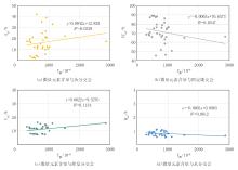 杨孟达[36]认为煤岩中的元素主要来源于煤中的矿物质, 包括原生矿物质(植物吸收)和次生矿物质(沉积期碎屑输入), 主要由Si、Al、Fe等多种元素的氧化物与盐类组成。郭晨等[37]通过煤灰成分测试结果发现, 灰分矿物主要包括SiO2、CaO、Al2O3、Fe2O3等。利用33个样品试验数据, 用主量元素含量和微量元素含量与煤岩工业组分分别建立交会图(图3、图4)。从图中可以看出, 主量元素含量与灰分呈线性正相关(图3a, R2=0.96), 与固定碳呈线性负相关(图3b, R2=0.94), 与挥发分(图3c, R2=0.34)和水分(图3d, R2=0.22)相关性较差; 微量元素含量与煤岩各工业组分相关性均较差(图4, R2< 0.12)。这表明, 主量元素可有效表征煤中无机矿物和固定碳含量。然而, 挥发分与水分受有机质热解与孔隙结构控制, 与元素含量无显著相关性。