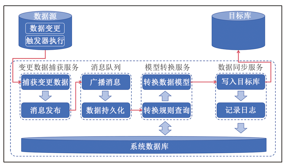 系统主要由系统数据库、变更数据捕获服务、消息队列、模型转换服务、数据同步服务5部分组成, 如图1所示。